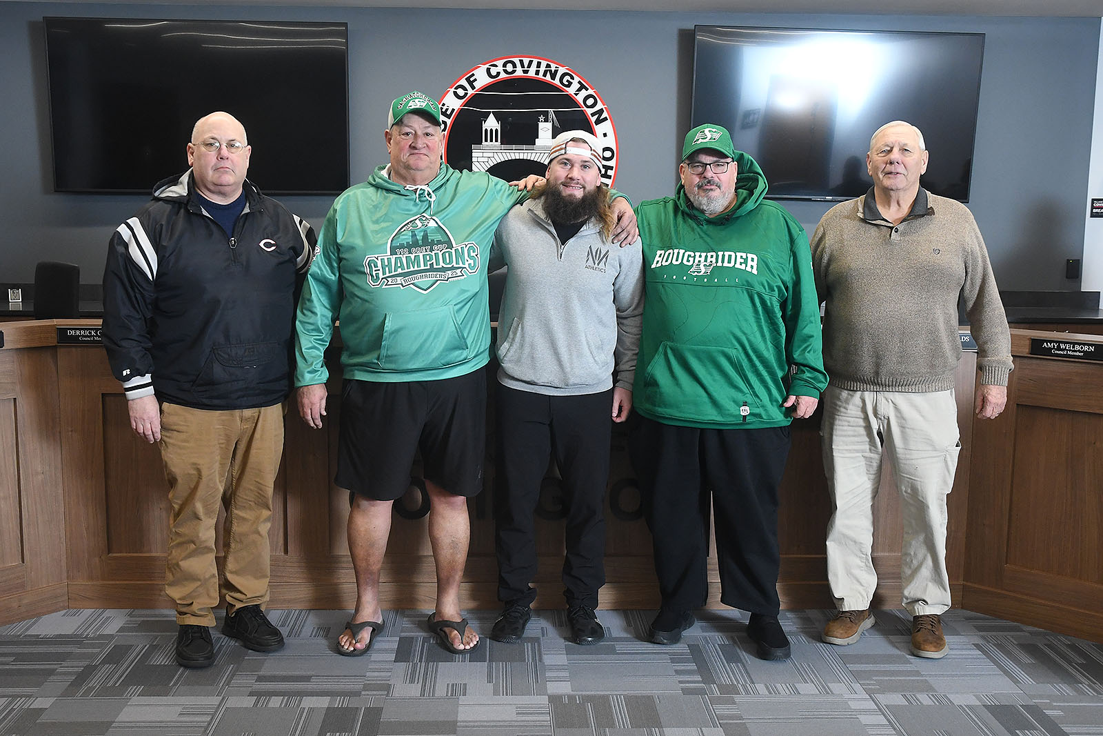 COVINGTON – The Covington Village Council honored A.J. Ouellette, a 2014 Covington graduate, during the Council Meeting on January 20, 2026 for his accomplishments in the Canadian Football League where he helped the Saskatchewan Roughriders win the Grey Cup Championship on November 16, 2025.