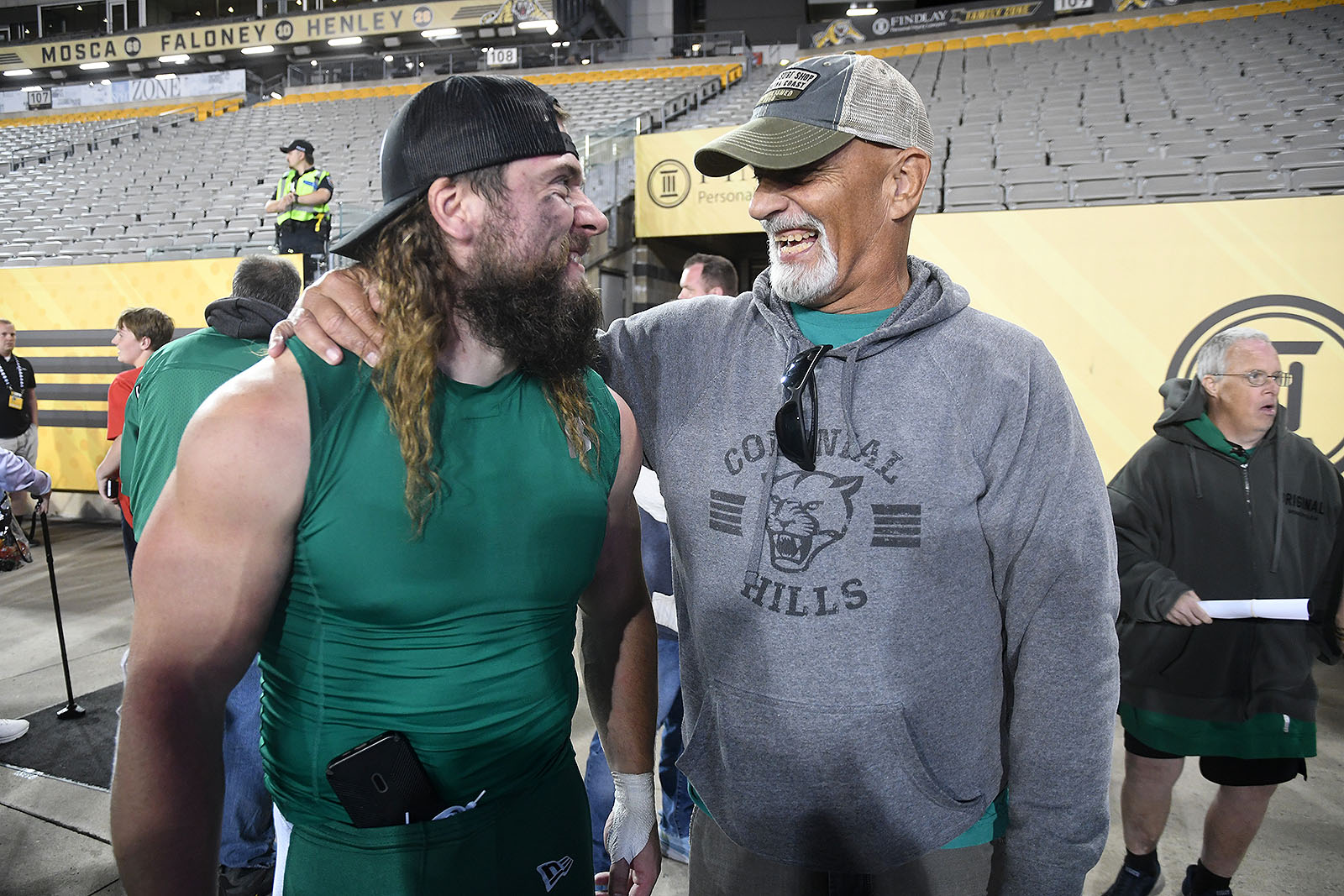 A.J. Ouellette has a funny conversation with another legendary Covington Buccaneer football player, Joe Schmidt. ©Ben Robinson/Color Green Photo