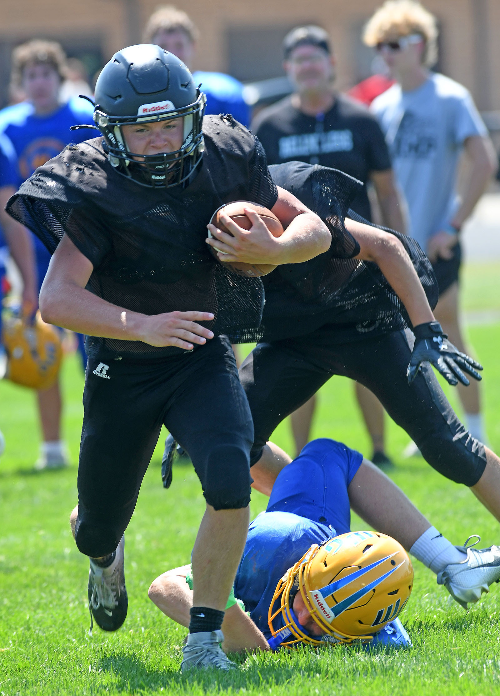 Each team scrimmaged each other starting at the 40 with ten offensive plays and then ten defensive plays. Then the teams scrimmaged each other starting at the 20 yard line with eight offensive and defensive plays.